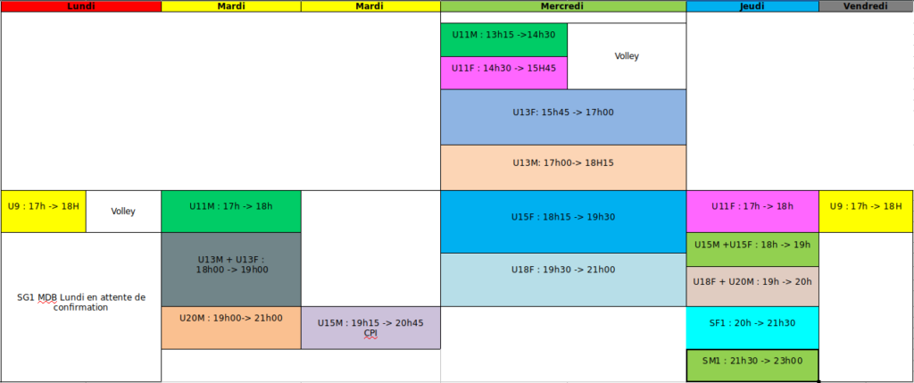 Sous réserves de modifications d’ici la rentrée, les horaires des entraînements sont disponibles dans la page « Equipes » ainsi que ci-dessous.