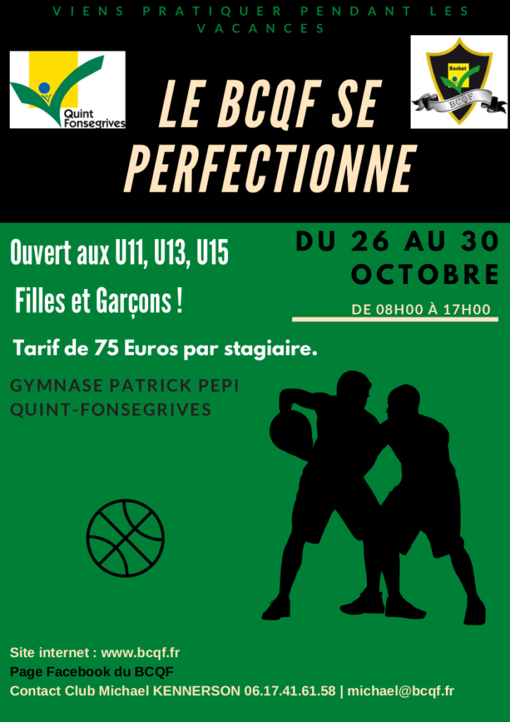 Le BCQF se perfectionne ! Stage de vacances d’automneBillet publié dans Stage le 6 octobre 2020 par Frederic.P Le BCQF organise un stage U11/U13/U15 du 26 au 30 octobre. Contactez Michaël Kennerson pour vous inscrire.