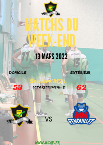 | DM2-P2-P2 | 102308 | BASKET CLUB QUINT FONSEGRIVES – 2 | FENOUILLET BASKET CLUB – 1 | 13/03/2022 | 53 | 62 |