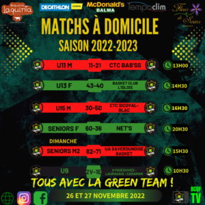 | DMU11-2 | 9179 | BASKET CLUB QUINT FONSEGRIVES | IE – CTC BAB’SS – 1 | 26/11/2022 | 11 | 21 |
