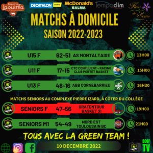 | DFU11-2 | 8292 | BASKET CLUB QUINT FONSEGRIVES | IE – CTC CONFLUENT BASKET – RACING PORTET BASKET – 1 | 10/12/2022 | 17 | 15 |