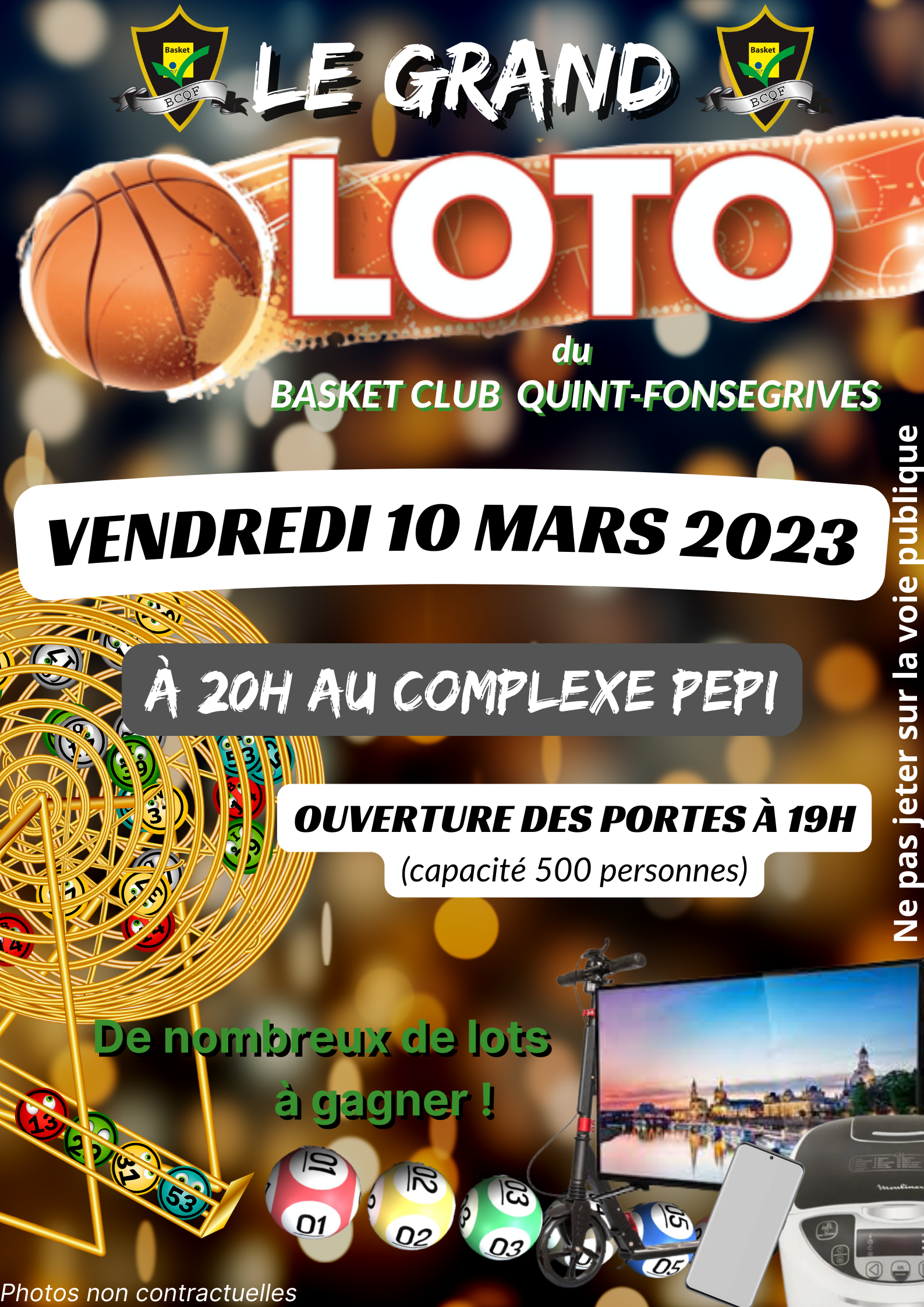 Loto du BCQF : vendredi 10 mars 2023Billet publié dans Evénement le 2 février 2023 par Frederic.P Ne manquez pas le grand LOTO du BCQF 2023 : réservez dès maintenant dans votre agenda la soirée du vendredi 10 mars !
