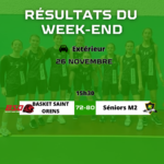 | DM2 | 13079 | BASKET SAINT ORENS – 2 | BASKET CLUB QUINT FONSEGRIVES – 2 | 26/11/2023 | 72 | 80 |