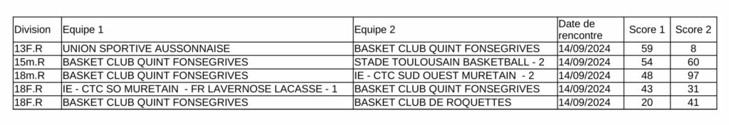 Résultats du weekend (14-15 septembre 2024)Billet publié dans Résultats le 15 septembre 2024 par Frederic.P View this post on Instagram A post shared by Basket Club Quint-Fonsegrives (@basketclubqf)